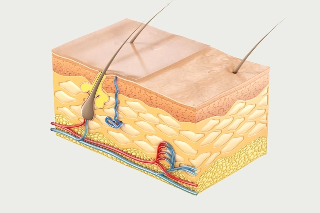 Our sweat and sebaceous glands are located in the dermis, as are the hair roots. It is densely permeated with tiny blood vessels to ensure the nourishment and oxygen supply of the entire skin. Its connective tissue structure also ensures firmness and elasticity.